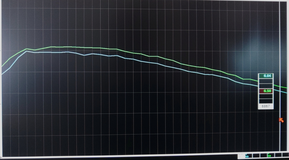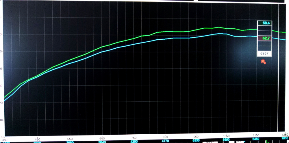尚、計測グラフは当社設置のメインライン社製プロハブによるものです。グラフ下のラインはノーマル計測で60.4psのパワーと9.83kgmのトルクを計測。グラフ上のラインがレギュラー仕様で66.8psのパワーと10.37kgmのトルクを計測しています。
